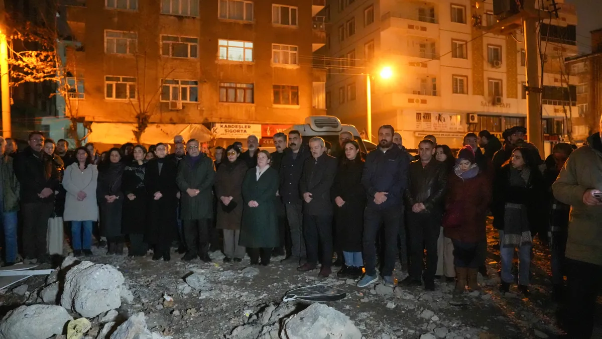 Bağlar Belediyesi Eşbaşkanları Leyla Ayaz ve Siraç Çelik,  6 Şubat Kahramanmaraş merkezli depremlerin üçüncü yıl dönümü nedeniyle Sözel Apartmanı’nın enkazı önünde düzenlenen anmaya katıldı.