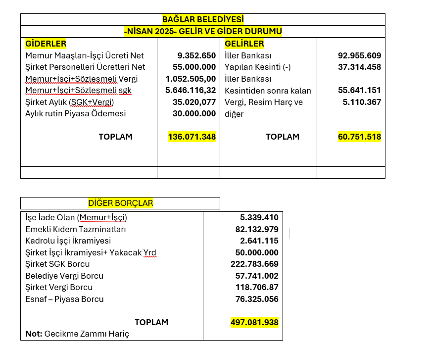 Kêmasiya budceya me ya salane, an jî, deynê me, gihîştiye 553,462,138.04 Lîreyên Tirkî. Û ev hejmar berdewam dike. Sûcdarê sereke yê li pişt vê rewşê rêveberiya qeyûm e, ku di pênc salan de 664 karmend girtine . Îro, di bersiveke bihêz de ji bo hemî derewan, em radigihînin: Karmendên Şaredariya Bağlarê ji hejmara ku me mîras girtiye pir kêmtir in! Ji ber ku, tevî hemî xetereyan, rêveberiya me karmendên ku bi neqanûnî hatine girtin ji kar dûr xistiye. Û ti karmendên nehewce jî negirtiye!