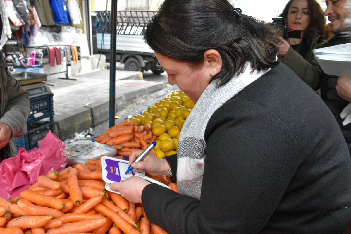 Di dema serdanê de, etîketên bihayê yên ku navên sebze û fêkiyan bi zimanê Kurdî li ser wan hatibûn nivîsandin, li esnafên bazarê hatin belavkirin.
