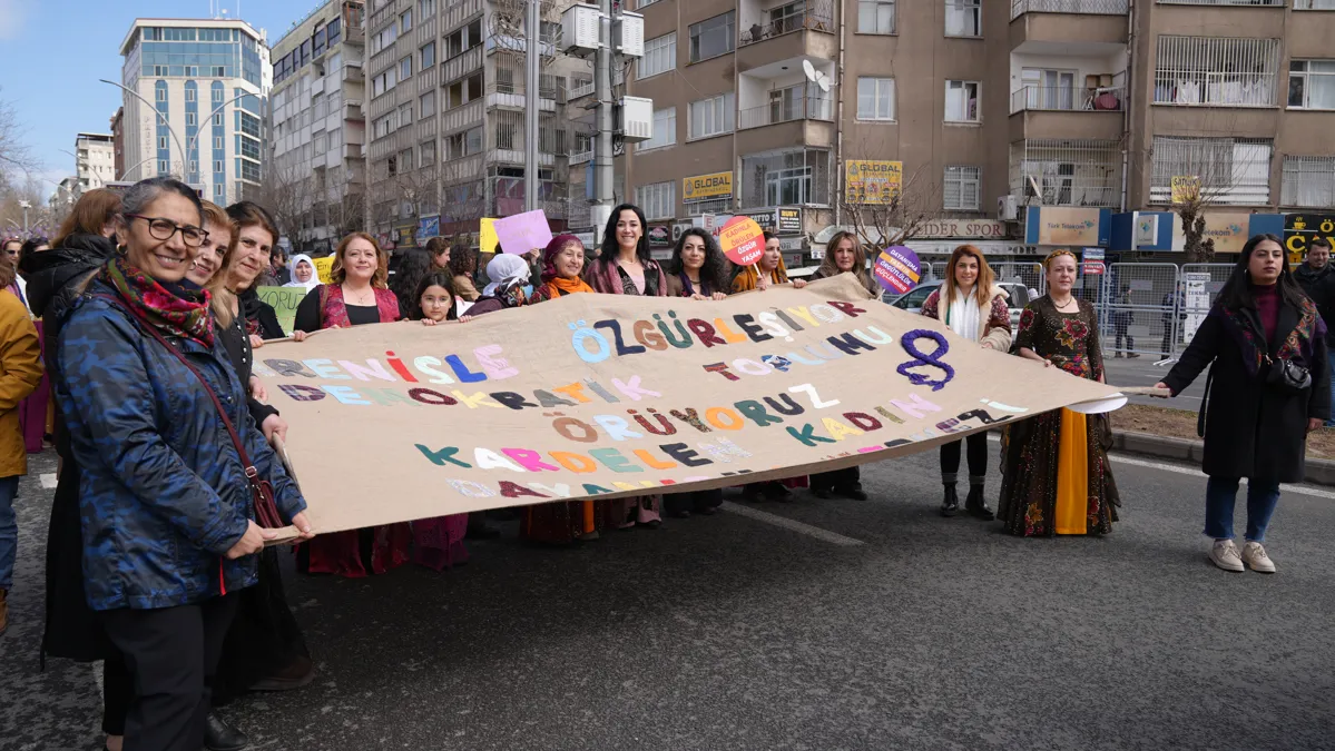Bağlar Belediyesi Eşbaşkanı Leyla Ayaz, "Direnişle özgürleşiyor demokratik toplumu örüyoruz" sloganıyla düzenlenen 8 Mart mitingine katıldı.