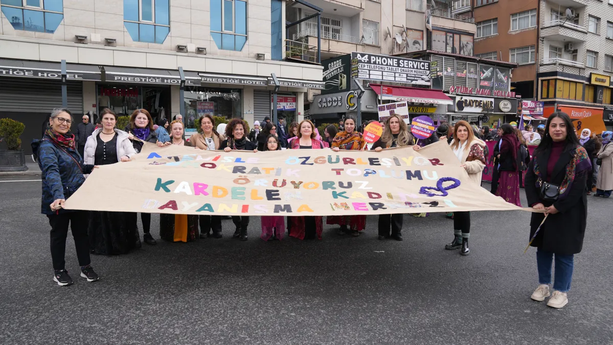 8 Mart Dünya Emekçi Kadınlar Günü, İstasyon Meydanı’nda mitingle kutlandı. Miting alanına kortejlerle yürüyüş yapılarak sloganlar ve pankartlarla girildi. Mitinge Bağlar Belediyesi Eşbaşkanı Leyla Ayaz, Eşbaşkan Yardımcısı Jiyan Aslan, Meclis üyeleri, Kadın Politikaları Müdürlüğü ve kadın emekçilerle birlikte katıldı.