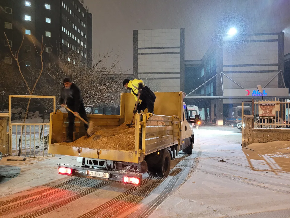 Gece boyunca 4 tuzlama aracı, 4 kepçe, 2 greyder, 2 kar küreme kamyonu ile hastaneler başta olmak üzere çalışmalar yürütüldü.