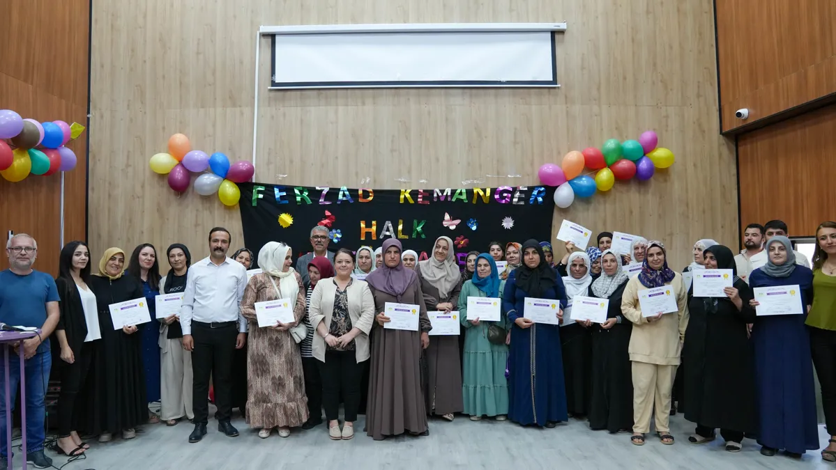 Kültür ve Sosyal İşler Müdürlüğüne bağlı Ferzad Kemanger Halk Kütüphanesi’nde kurslara katılan çocuklar ve kadınlara sertifika verildi. Eş Başkanlar Leyla Ayaz ve Siraç Çelik de mezuniyet törenine katılarak kursiyerleri tebrik etti.