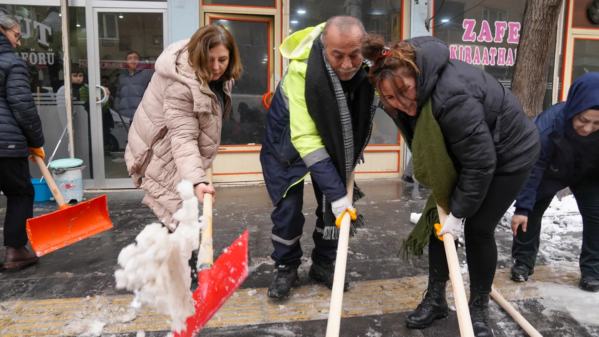 Kadın Politikaları Müdürlüğünün öncülüğünde; kadın meclis üyeleri, Zabıta Müdürlüğü ve farklı birimlerde görev yapan kadın emekçiler, Nükhet Coşkun Caddesi’nde esnaf ve yurttaşlarla birlikte kaldırımlarda kar küreme çalışması yaptı.