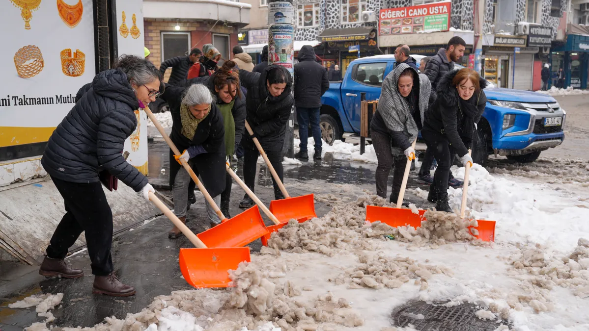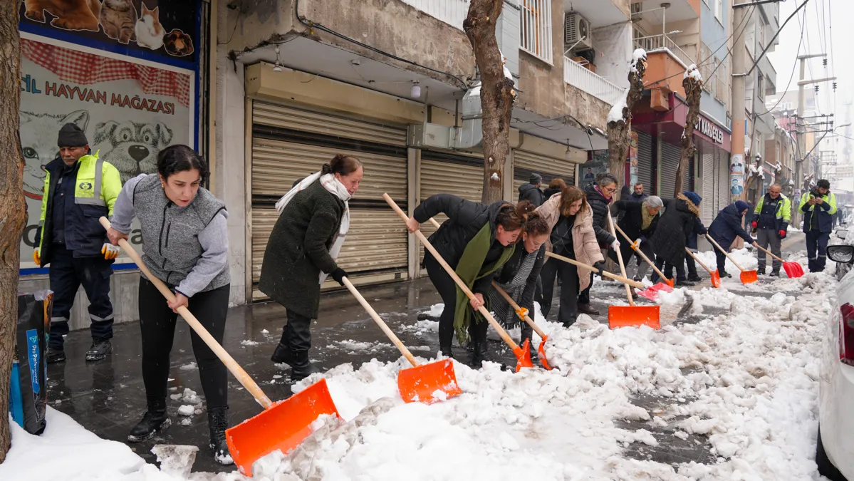 Bağlar Belediyesi Kadın Politikaları Müdürlüğü öncülüğünde kolektif kar çalışması yürütültü. Kaldırımlar, kadın emeği ve kolektif bir ruhla temizlenerek ulaşıma güvenli hale getirildi.