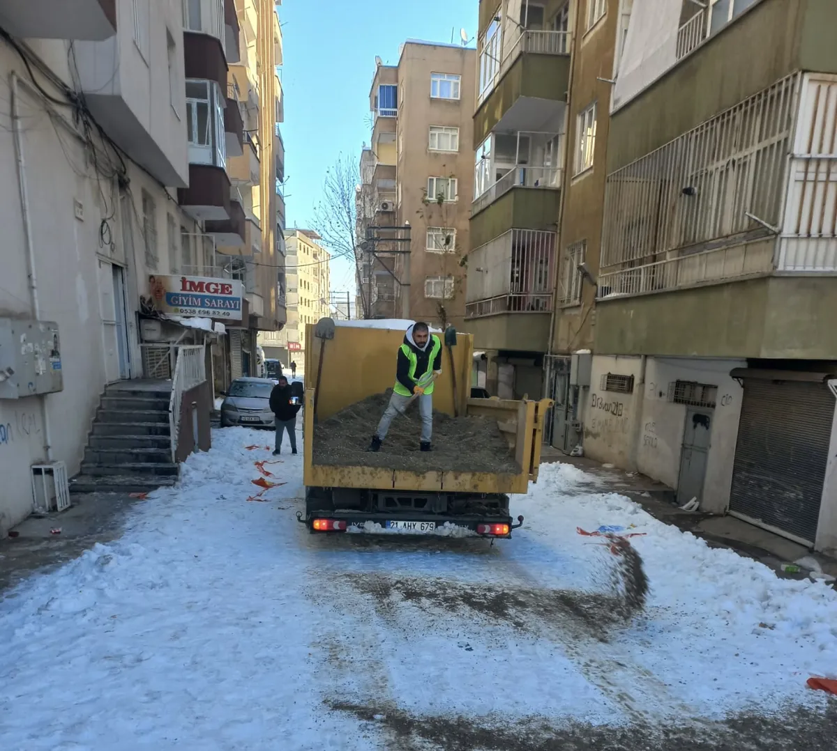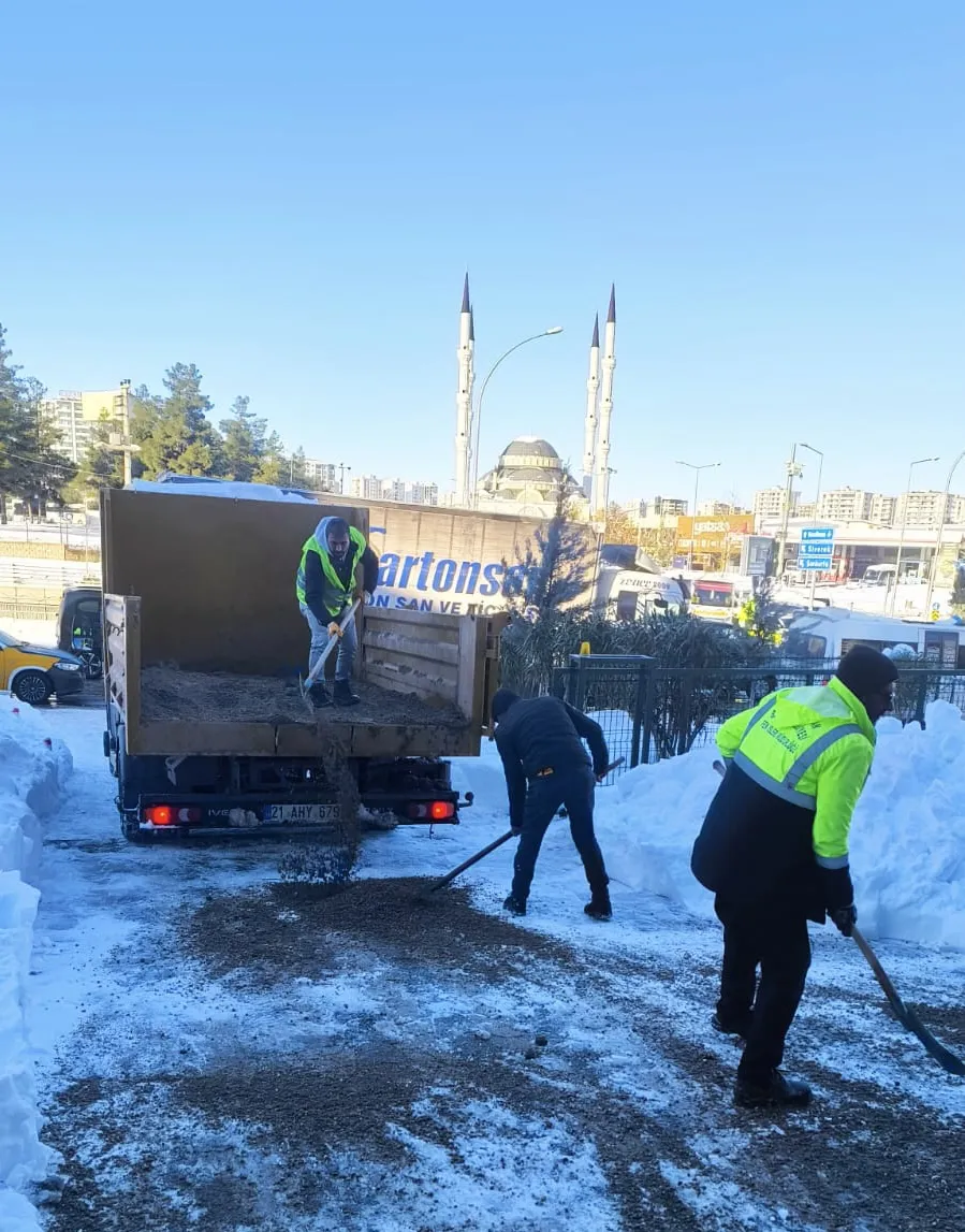 Bağlar Belediyesi’nin 250 kişilik ekibi, kepçe, kar küreme, pikap, kamyon, tuzlama aracı, greyderlele ulaşımın güvenliği için sahada.
