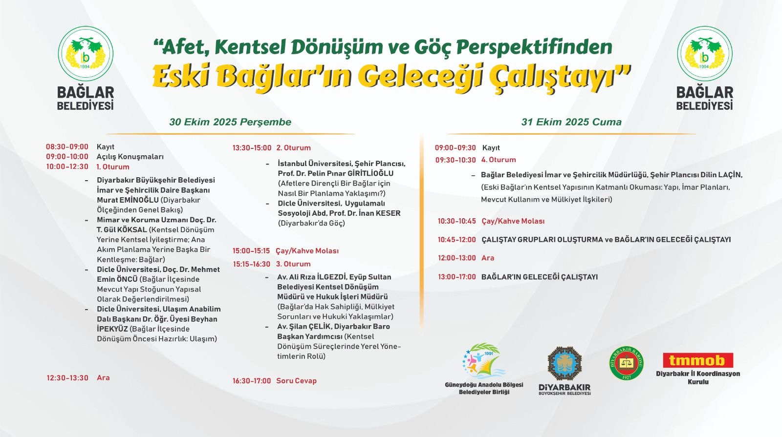 Bağlar Belediyesi, 6 Şubat 2023'te meydana gelen depreminin de etkisiyle Eski Bağlar’da gittikçe derinleşen imar ve kentleşme sorunlarına çözüm bulmak amacıyla önemli bir çalıştay düzenliyor. “Afet, Kentsel Dönüşüm ve Göç Perspektifinden Eski Bağlar’ın Geleceği” başlığıyla düzenlecek çalıştayda alanında uzman konuklarla kentsel iyileştirme, deprem dirençli kentler, mekânsal dönüşüm ve afet sonrası yeniden yapılanma gibi birçok başlıkta sunumlar ve tartışmalar yürütülecek.