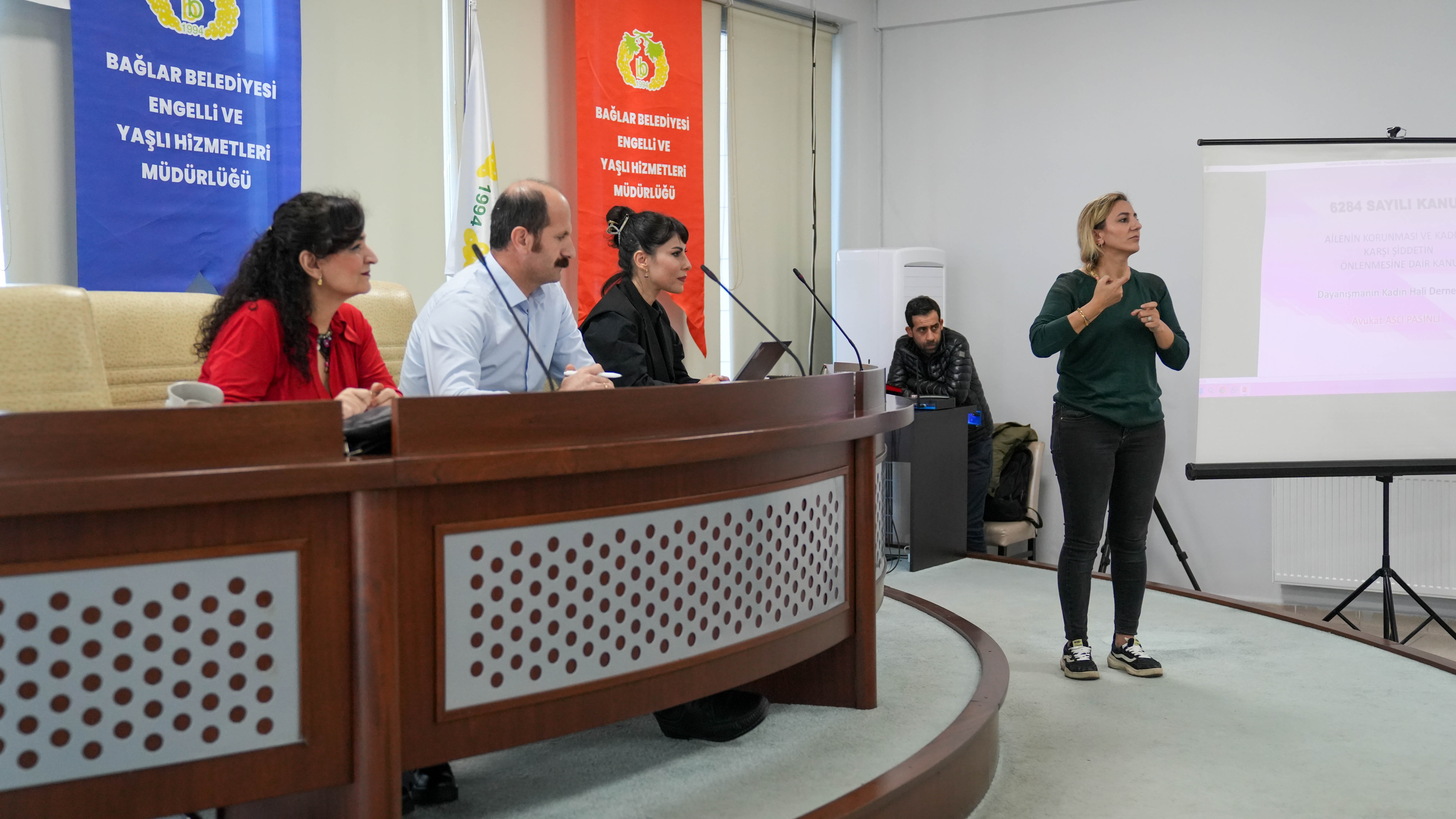Bağlar Belediyesi Engelli ve Yaşlı Hizmetleri Müdürlüğü tarafından 25 Kasım Kadına Yönelik Şiddete Karşı Uluslararası Mücadele Günü çalışmaları kapsamında “Barış ve Demokratik Toplum İnşasında Bir Şiddet Biçimi Olan Sağlamcılık” temalı farkındalık söyleşisi düzenlendi. Belediye Meclis Toplantı salonunda personellere yönelik düzenlenen söyleşiye Eş Başkan Leyla Ayaz ve Siraç Çelik, DEM Parti Engelliler Komisyonu Eş Sözcüleri Hatice Betül Çelebi ve Sinan Ok, Dayanışmanın Kadın Hali Derneği (DAKAHDER) Başkanı Av Aslı Pasinli katıldı.