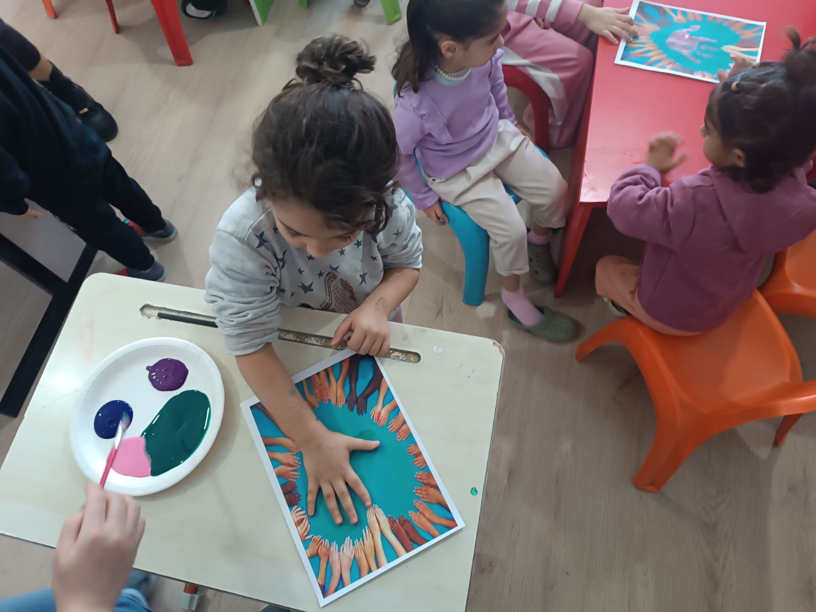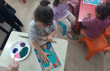 Çocuklar, dinledikleri masalı kendi bakış açılarıyla resmederek yaratıcılıklarını ortaya koydu ve el baskısı yaptı.