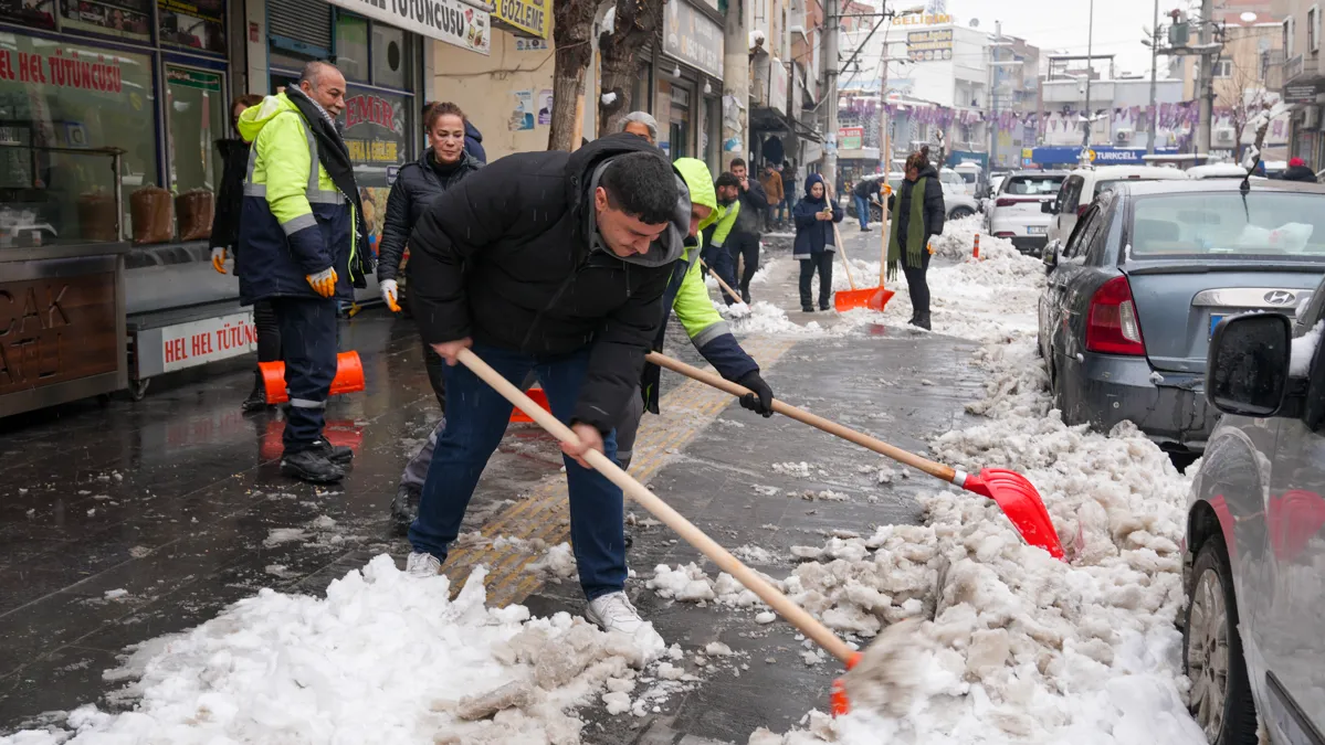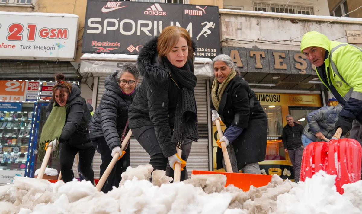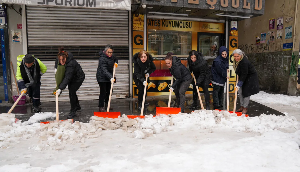 Kadın Politikaları Müdürlüğünün öncülüğünde; kadın meclis üyeleri, Zabıta Müdürlüğü ve farklı birimlerde görev yapan kadın emekçiler, Nükhet Coşkun Caddesi’nde esnaf ve yurttaşlarla birlikte kaldırımlarda kar küreme çalışması yaptı.