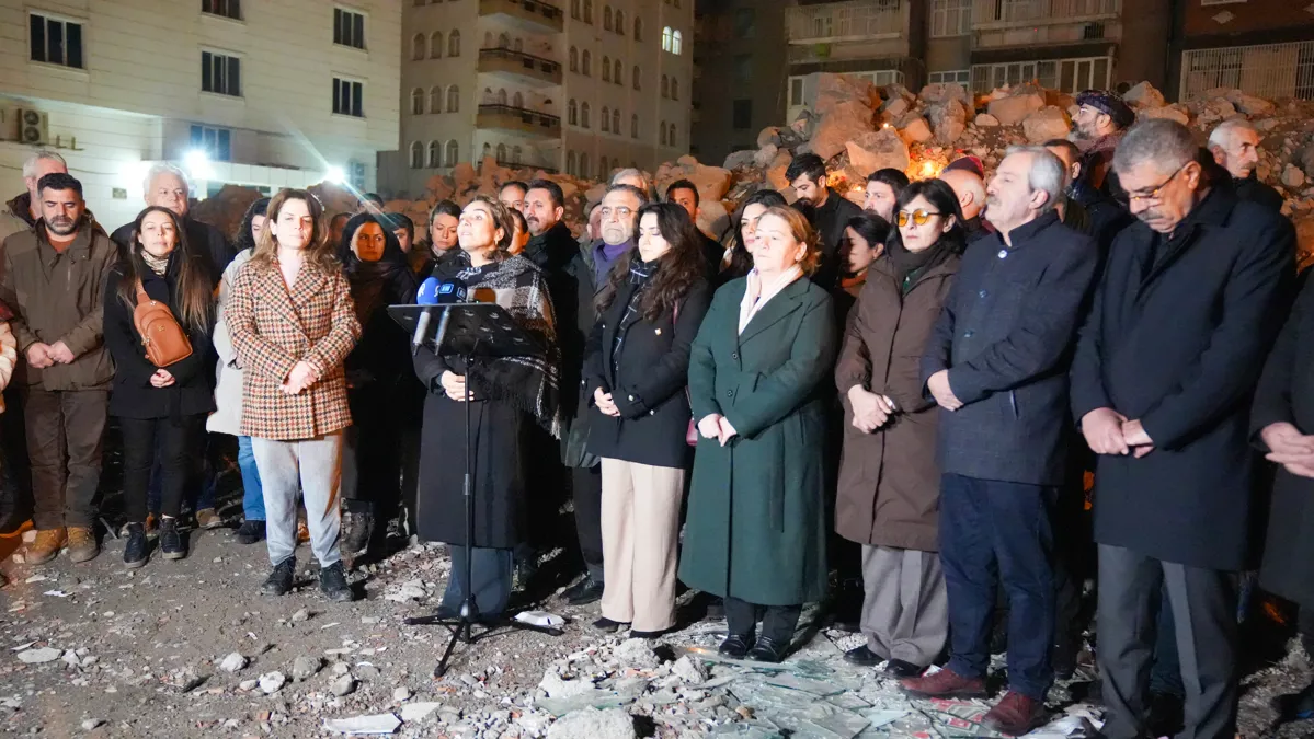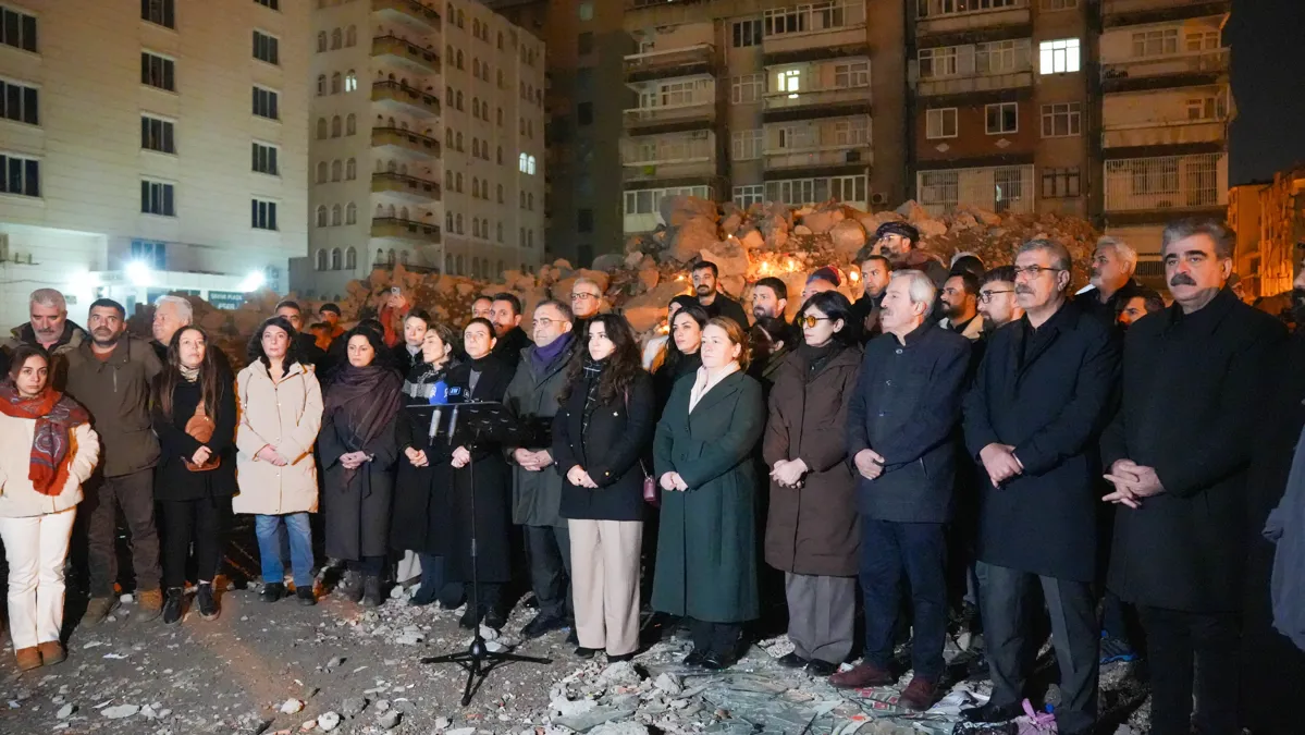 Bağlar Belediyesi Eşbaşkanları Leyla Ayaz ve Siraç Çelik, 6 Şubat Kahramanmaraş merkezli depremlerin üçüncü yıl dönümü nedeniyle Sözel Apartmanı’nın enkazı önünde düzenlenen anmaya katıldı.