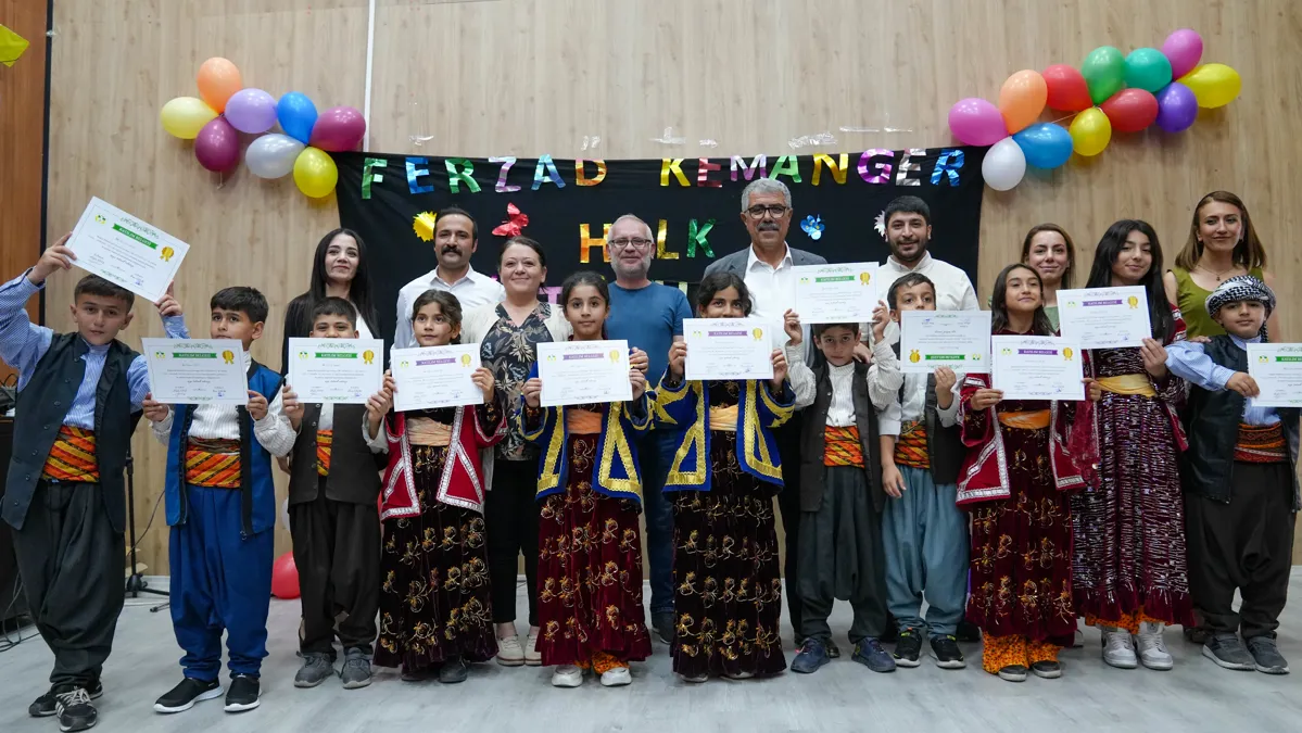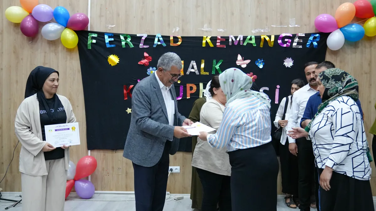 Kültür ve Sosyal İşler Müdürlüğüne bağlı Ferzad Kemanger Halk Kütüphanesi’nde kurslara katılan çocuklar ve kadınlara sertifika verildi. Eş Başkanlar Leyla Ayaz ve Siraç Çelik de mezuniyet törenine katılarak kursiyerleri tebrik etti.